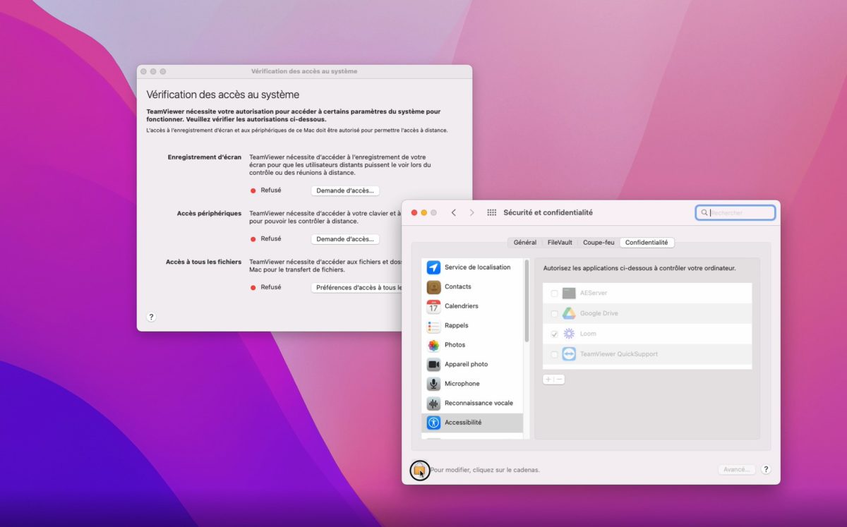 Pour ces paramètres, il faudra cliquer sur « Demande d’accès », ensuite sur le cadenas (le mot de passe de votre session vous sera demandé) et enfin cocher TeamViewer Quick Support pour accorder l’accès.