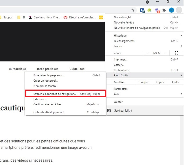 Ouvrez Google Chrome, en haut à droite de la barre de navigation, cliquez sur le menu (représenter par les 3 points verticaux), puis cliquez sur « Plus d’outils » et ensuite sur « Effacer les données de navigation… »