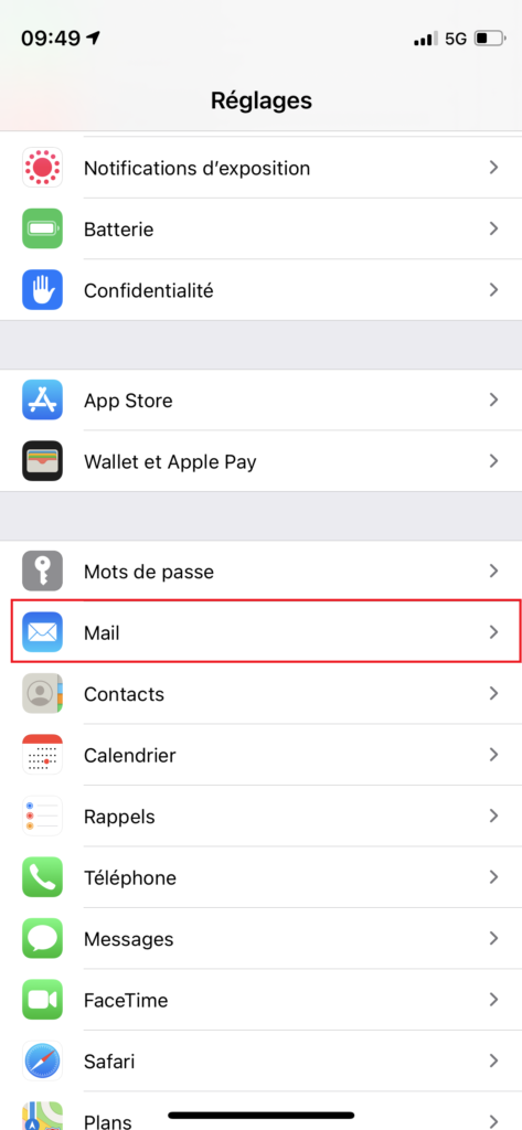– Cliquez sur l’application “Réglages“, “Mail” (ou “Comptes et mots de passe” selon la version d’iOS installé sur votre iPhone) puis “Comptes