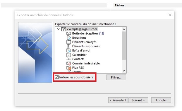 Pour une sauvegarde totale, n’hésitez pas à sélectionner juste la boite mail et de bien cocher la case « inclure les sous-dossiers »