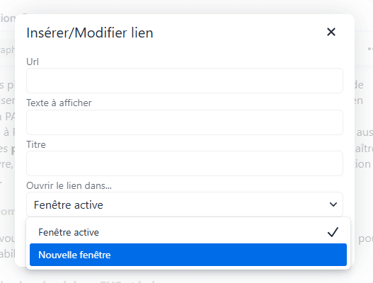 Ici nous vous recommandons de privilégier « Ouvrir le lien dans … Nouvelle fenêtre« . Cela vous permettra de garder l’internaute sur votre site.