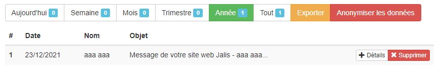 Tout à droite seront situés deux boutons « Détails » et « Supprimer ». Le bouton Détails va vous permettre d’afficher le formulaire reçu sur l’intégralité de votre écran et ainsi de visualiser entièrement le message reçu pour une lecture plus facile et rapide. Le bouton Supprimer vous permet de supprimer le formulaire si vous le souhaitez (par exemple s’il s’agit d’un spam).