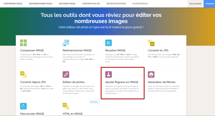 Pour ajouter un filigrane sur vos photos, nous vous recommandons de travailler directement avec ce site. Il s’agit d’un outil accessible depuis le moteur de recherche Google et 100% gratuit en terme d’utilisation. Cet outil vous permet de réaliser plusieurs actions sur vos images comme :