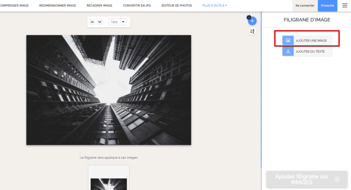 Ensuite, vous devez sélectionner l’image que vous souhaitez travailler parmi les fichiers enregistrés sur votre poste informatique. Une fois que vous avez choisi votre image, vous aurez un aperçu de celle-ci sur votre écran avec deux possibilités sur la gauche de votre écran. Enfin, vous devez cliquer sur le bouton « Ajouter une image » puis choisir de nouveau l’image qui représentera votre filigrane sur votre première image choisie.