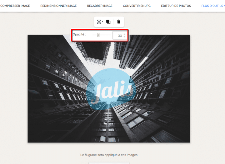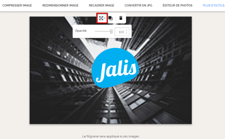 Une fois que vous avez choisi votre image comme filigrane, vous devez cliquer sur le petit onglet carré ci-dessous afin de régler l’opacité du filigrane sur votre photo.